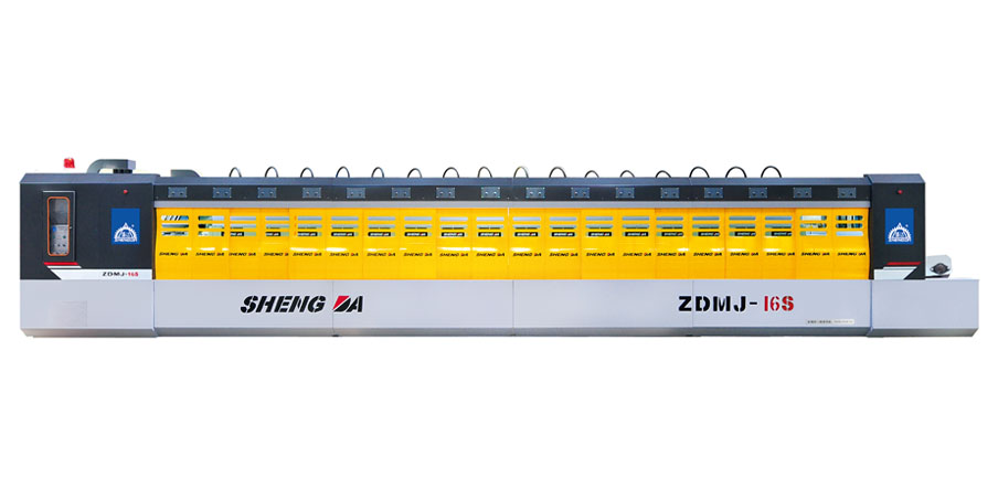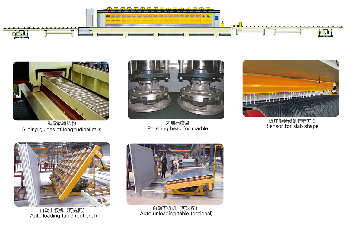 二、纵梁式一体结构,大理石磨盘为磨抛刀具,四类磨盘按直线排列安装于动梁,送料方式采用平板直行输送自动连续喂料;