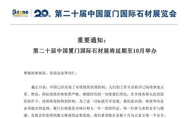 尊敬的参展商下午好! 根据最近厦门国际石材展组委通知: 1、第二十届中国厦门国际石材展延期至2020年10月27-30日 2、第二十一届中国厦门国际石材展定于2021年5月18-21日 3、“云上厦门石材展”平台将于2020年6月6日正式上线 为了尽快恢复商贸活动,我们也将配合组委会...