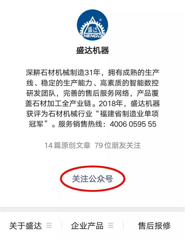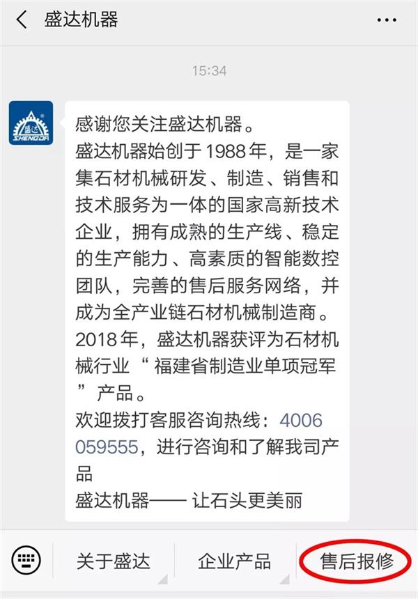 为了方便客户快速下单,实现更快捷、更高效、更专业的售后服务,让盛达的每一位客户,在互联网资讯时代都能快捷便利享受到完善的专业服务,盛达机器经过三个月的试运行,现正式向市场投入运行公众号客户报修系统。
