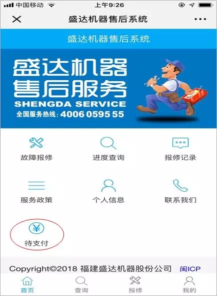 机台超过保修期的,客户可在维修结束后 通过点击“待支付”完成相关费用的支付。 或通过扫描线下公司“收款二维码” 完成支付。