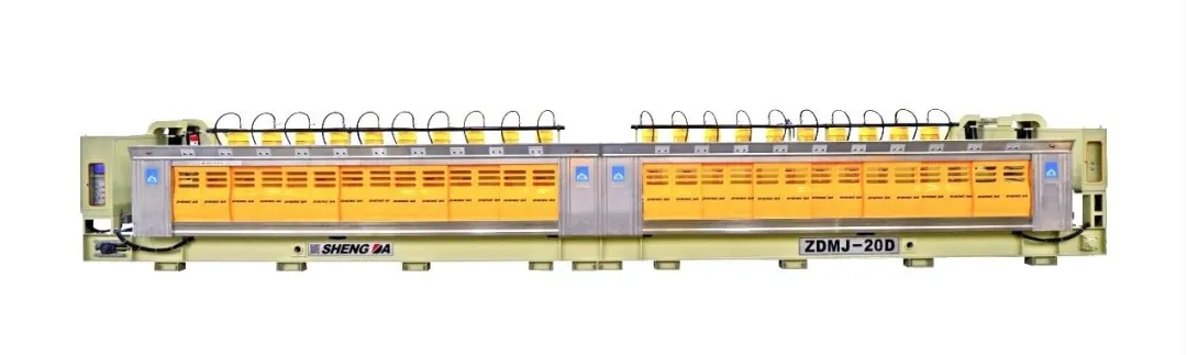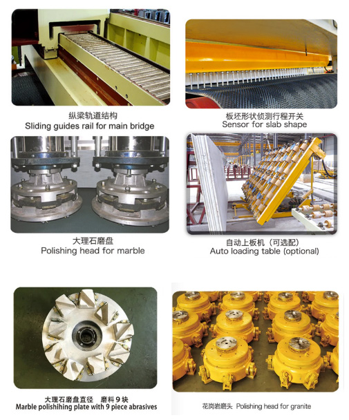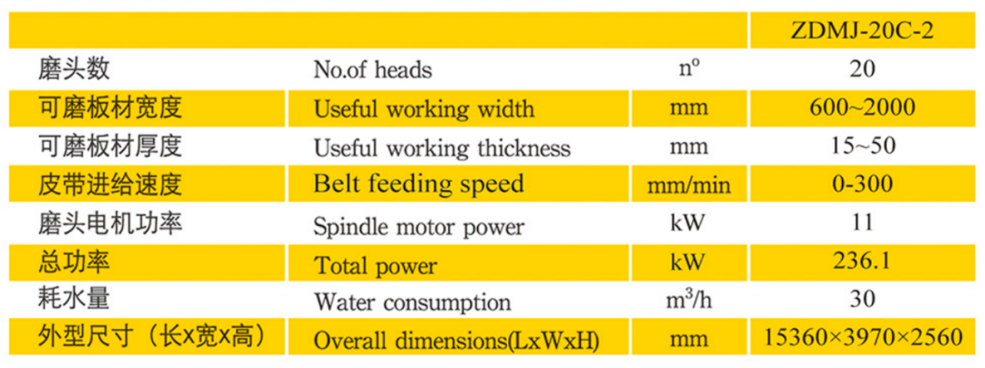 两段式自动磨机ZDMJ-20C-2 采用了最新开发研制成功的PLC中控系统与触模式操作终端, 可以人性化地操作、控制各个精密部件的协调运动和实时监控石板材在磨抛的全过程。同时机器运行过程中发生机电故障时,也能引导操作人员进行排除。机器自动化程度高,降低了操作者的劳动强度。机器结构上采用了两段式横梁,每段横梁上各配有10个磨头(共20个磨头),冷却水系统,减速机电机等零部件,通过减速传动轴,齿轮齿条的换向可实现横梁主体和磨头做独立的往复快速移动。使磨头高效率地自动磨抛大理石或花岗岩板材。