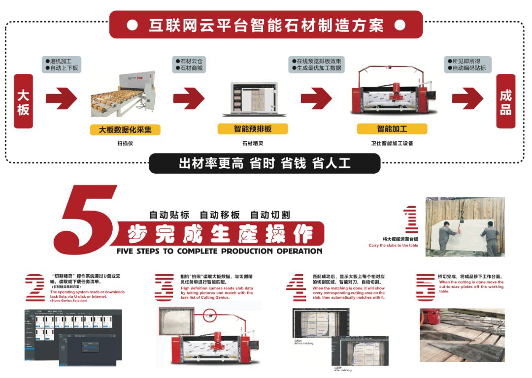只需五步即可完成生产操作:一、将大板运至台板;二、切割精灵读取任务清单;三、相机拍照与数据切割纹路进行匹配;四、一键自动完成智能对刀、自动切割;五、切割完成,将成品下板。