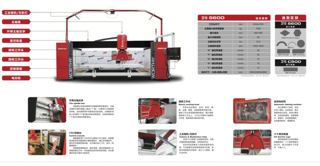 随着科技的发展与社会的进步,各行各业的发展都免不了往,自动化、智能化、无人化发展,因此在石材行业也不例外。众多石材机械企业纷纷推出各种的解决方案,作为行业的头部企业盛达机器,借由与世界石材设备商Breton合作生产,与行业中的独角兽——链石科技配合软件应用,三方强强强联手,在今年初推出了卫仕S600五轴智能桥切,一台更符合国人使用的意式加工「怪兽」,而真正的五轴桥切需要具备的完整功能包括:一、任意角度切割;二、45度背倒切割;三、圆弧切割;四、不规则切割。*进行45度背倒切割需测厚度才能确保切割精度。