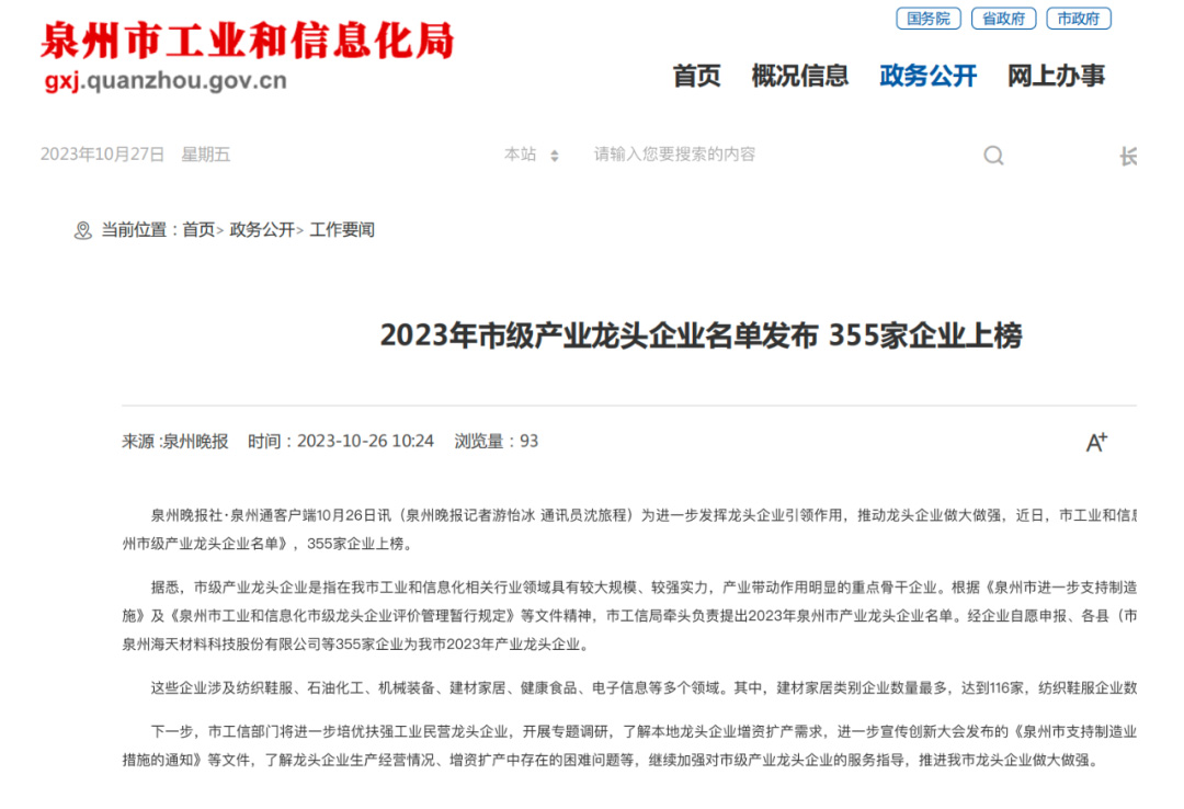 为进一步发挥龙头企业引领作用,推动龙头企业做大做强,近日,市工业和信息化局印发《2023年泉州市级产业龙头企业名单》,355家企业上榜。