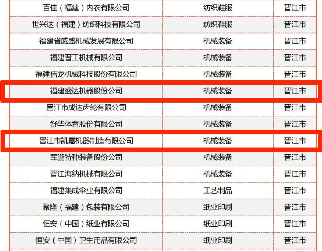 晋江市共有91家企业上榜名单,其中机械装备行业仅有9家企业,盛达机器、凯嘉机器赫然在列。