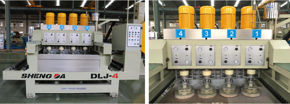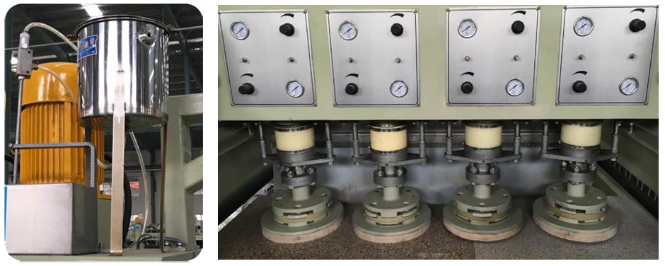 ❈ 磨头内配置独特减震装置,提高石板磨抛质量。每个磨头升降均采用双气缸独立控制,磨抛压力可调。