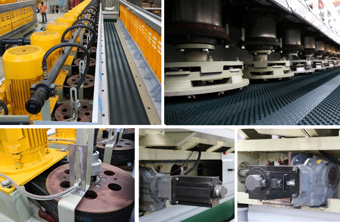 二、纵梁式一体结构,大理石磨盘为磨抛刀具,四类磨盘按直线排列安装于动梁,送料方式采用平板直行输送自动连续喂料;