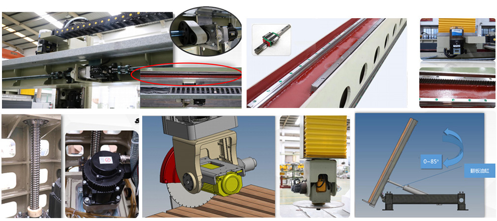 ※ 切割锯片安装在电主轴,电主轴安装摆动轴,摆动轴安装在旋转轴,旋转轴安装在上下滑板,上下滑板安装在中间箱,中间箱安装在横梁上,锯片可实现五轴联动运行。