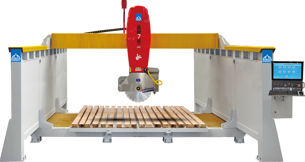 采用基于 PC的石材加工五轴联动数控系统,刀具由三个直线轴和两个旋转轴控制,两个旋转轴分别绕X轴和Z轴旋转。具有复杂五面体特征的制品切割、雕铣加工自动化功能,主要用于多维空间复杂曲面石材装饰精品加工。石材行业经历了多次的产品技术变革,刀具运动轨迹由5轴、6轴联动控制的加工装备的技术特征和优势日益明显,数控五轴桥式切石机正是这么一款以金刚石圆盘锯片为主切割刀具的具有柔性制造能力突出、高度自动化的加工装备。