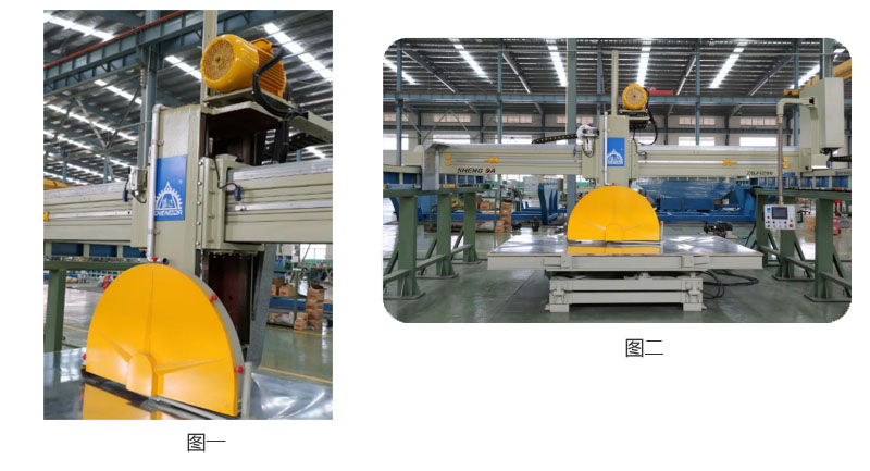 ❈ 切割锯片安装在主轴箱,主轴箱装在上下滑板,上下滑板安装在中间箱,中间箱安装在横梁上,锯片可上下左右运行。(图一)