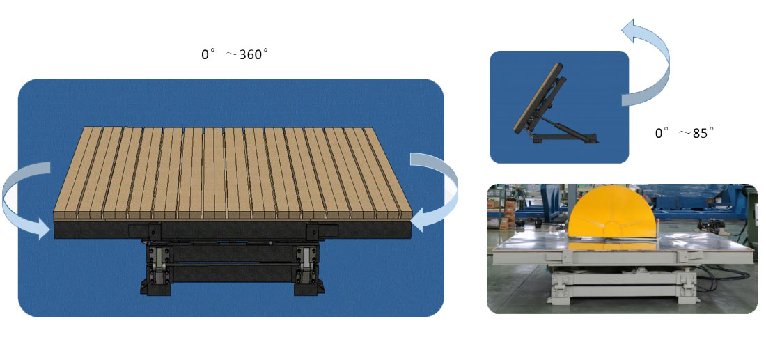 ❈ 独立工作台,液压控制工作台面:水平旋转90°或360° ,垂直翻转0° ~85°。